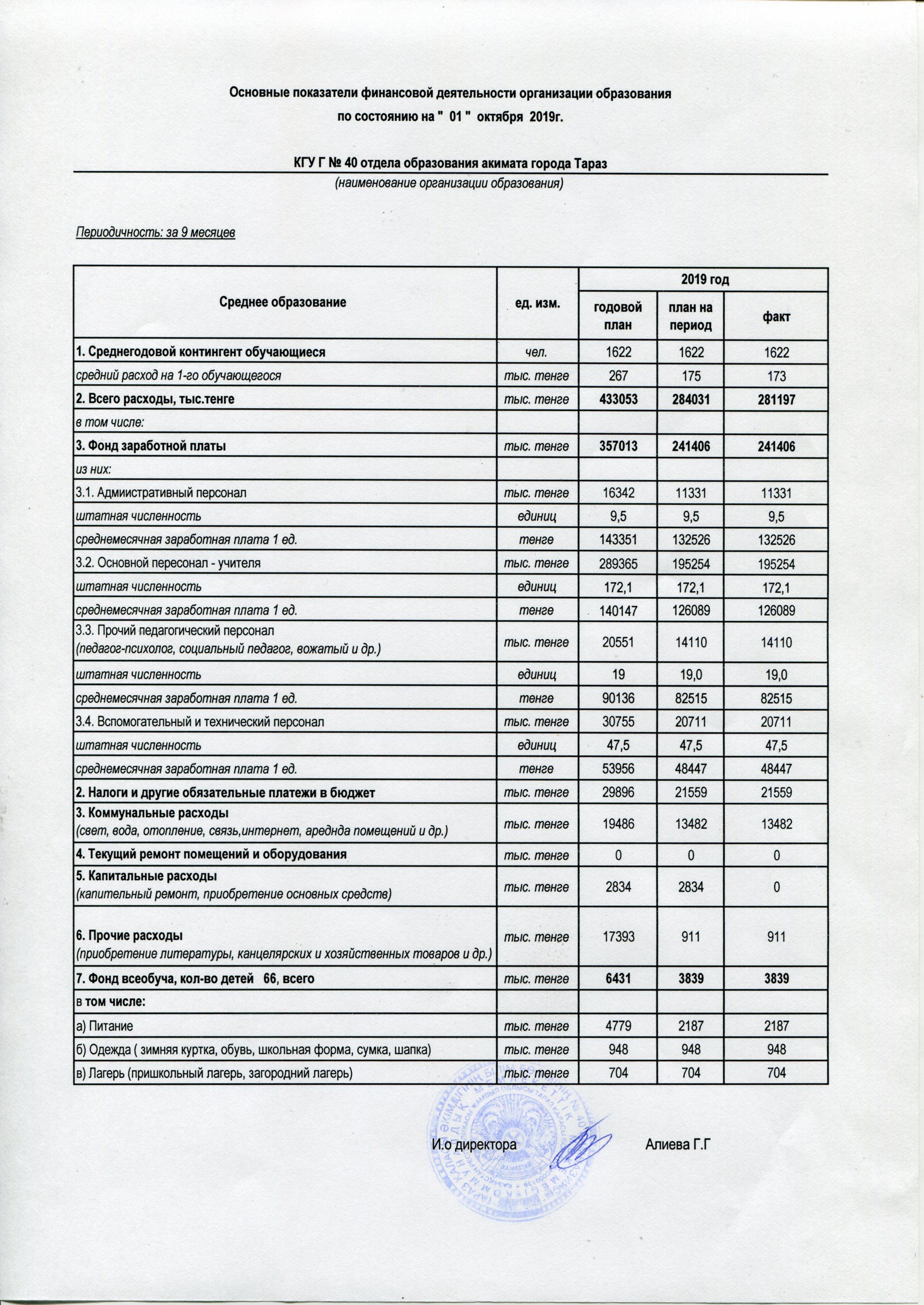 01 октябрь 2019 0 1 2 3 4 5 Основные показатели финансовой деятельности КГУ "Гимназия №40 отдела образования акимата города Тараз" по состоянию на 01 июля 2019г