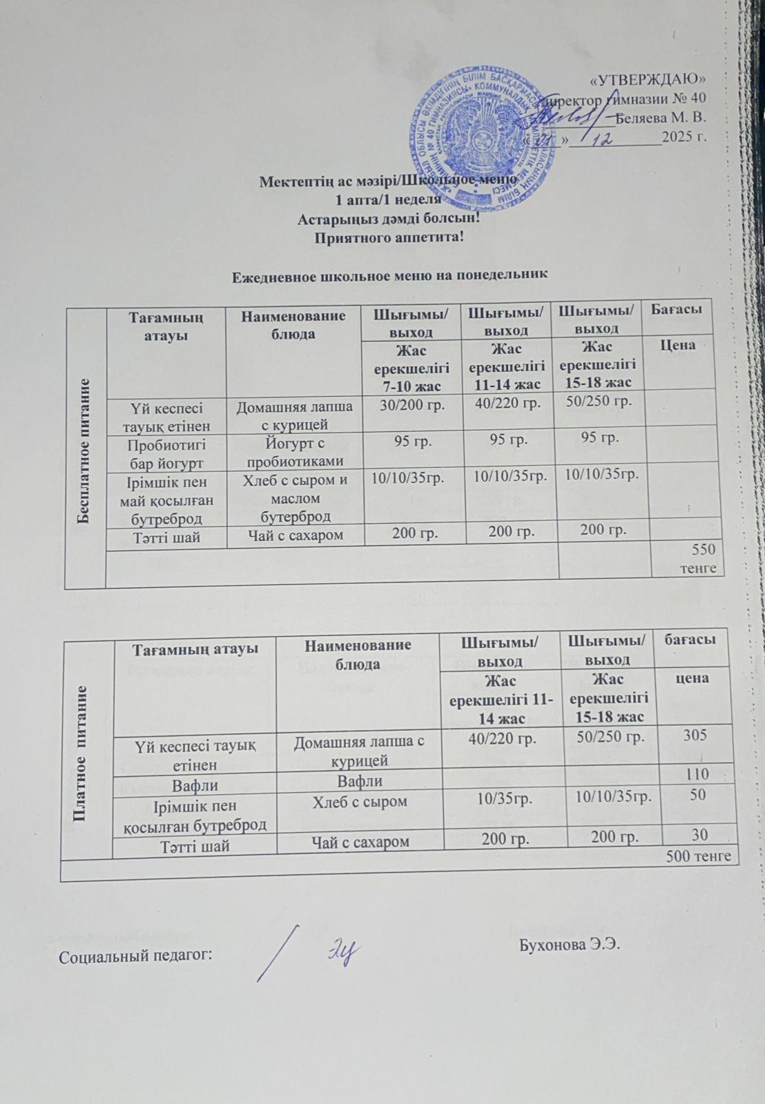 Ежедневное меню на 01.12.2025 г. » Гимназия №40