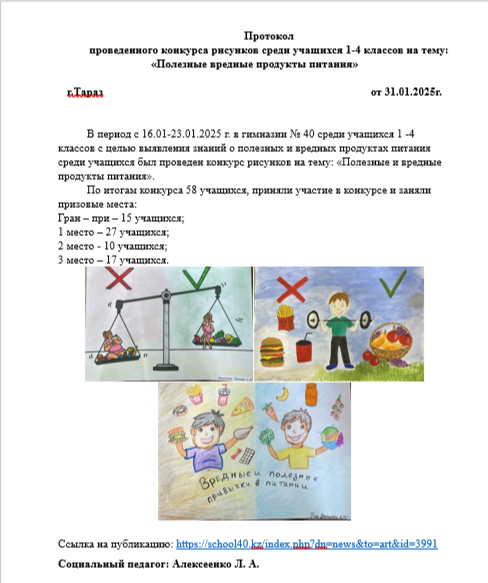 31 январь 2025 0 1 2 3 4 5 В период с 16.01 - 23.01ю2025 г среди учащихся 1-4 классов прошел конкурс рисунков на тему: "Полезные и вредные продукты питания"