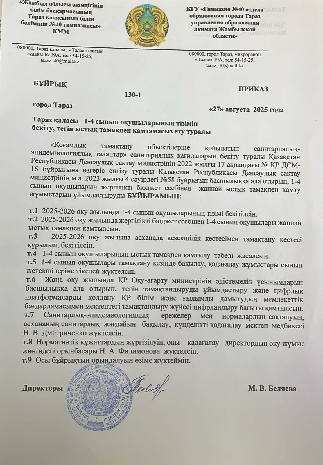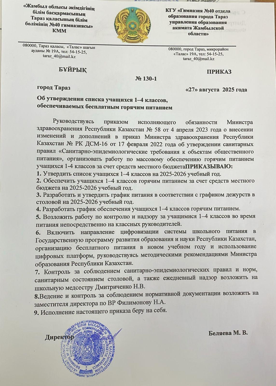 02 сентябрь 2025 0 1 2 3 4 5 Приказ № 130-1 об утверждении списка учащихся 1-4 класса обеспечиваемых бесплатным горячим питанием