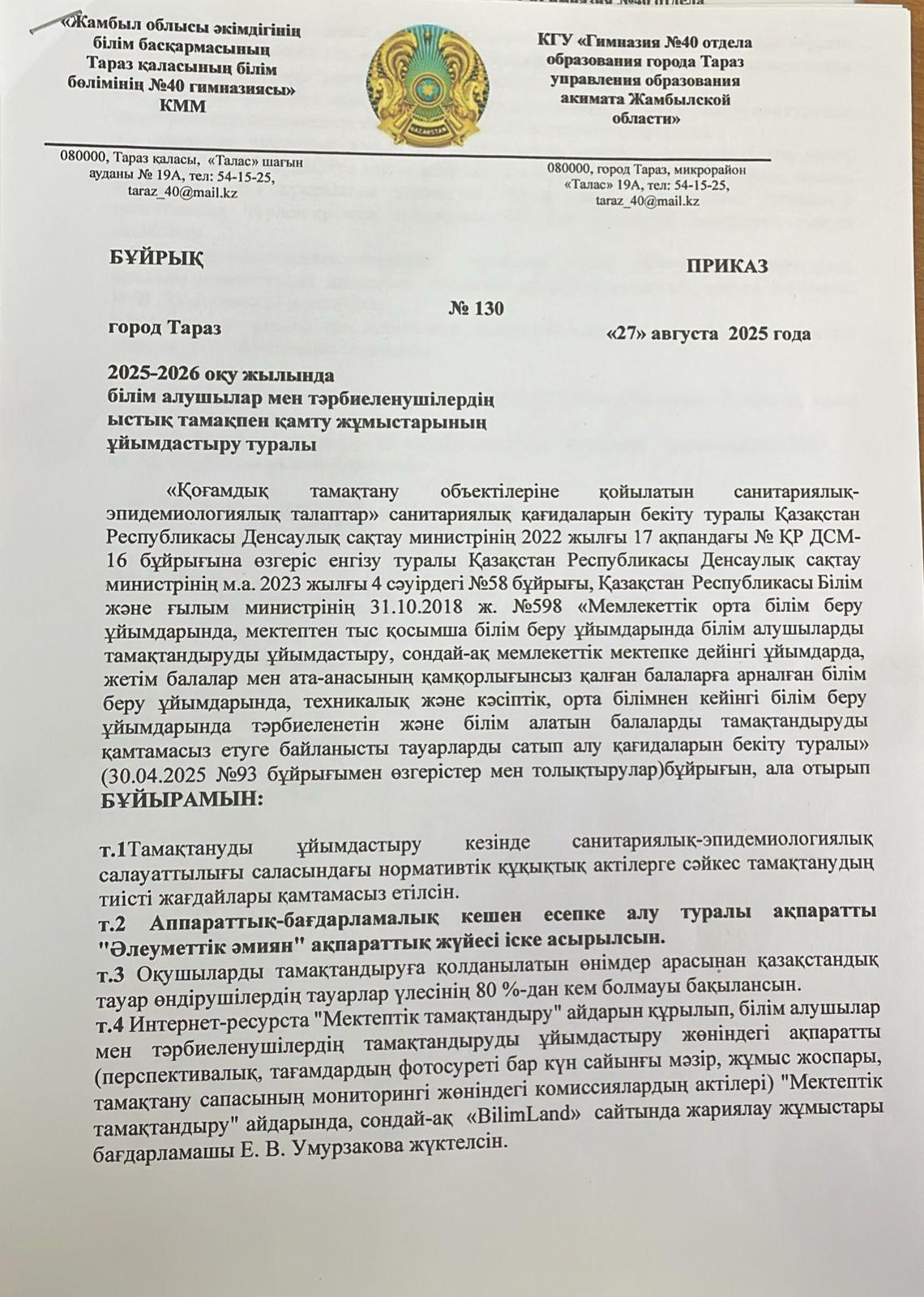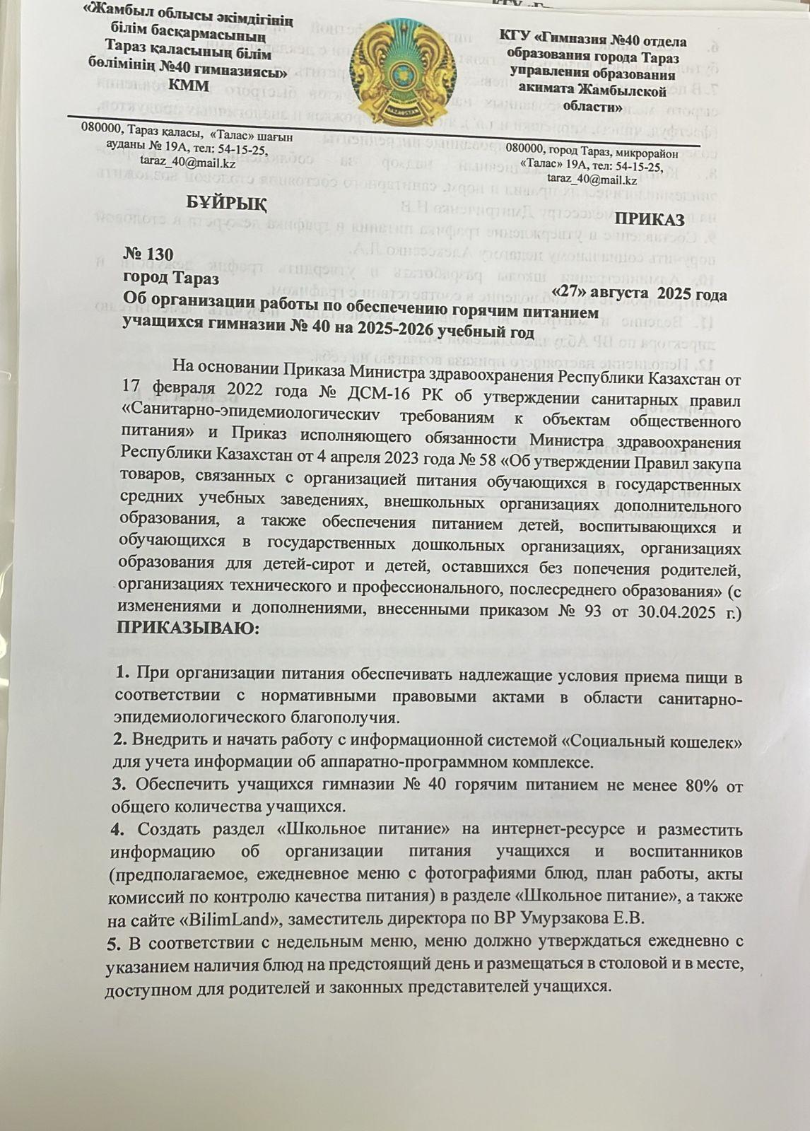 02 сентябрь 2025 0 1 2 3 4 5 Приказ № 130 Об организации работы по обеспечению горячим питанием учащихся гимназии № 40 на 2025 -2026 учебный год