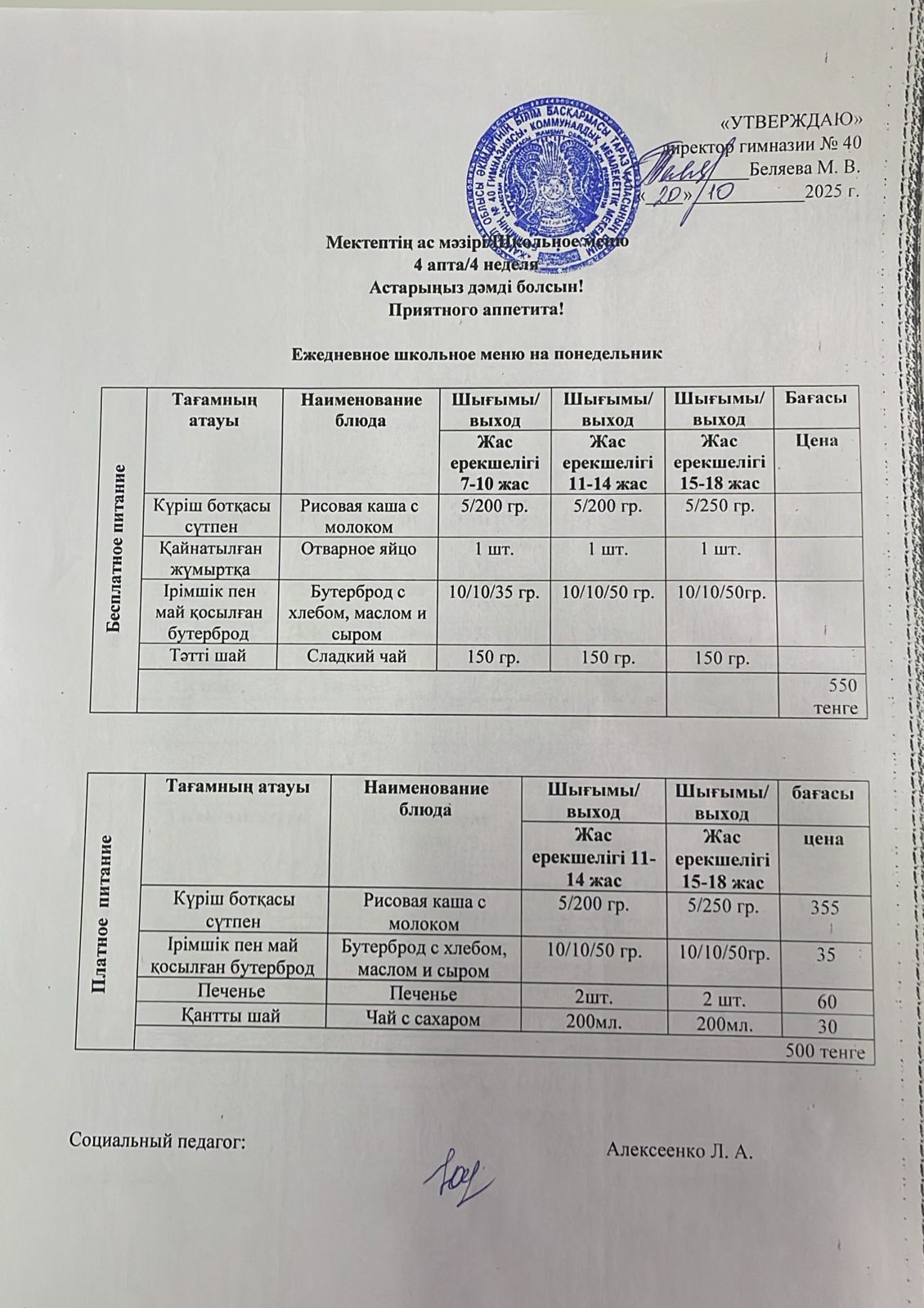 Ежедневное меню на 20.10.2025 г. » Гимназия №40