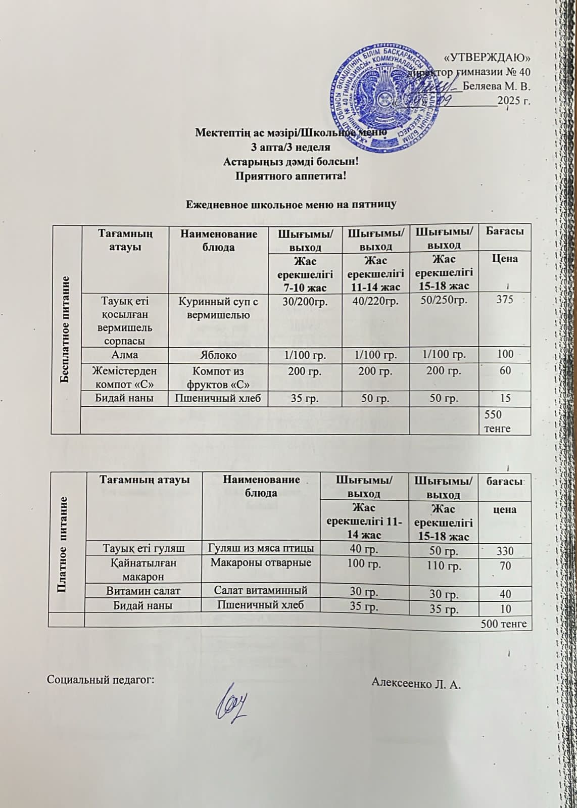 Ежедневное меню на 19.09.2025 г. » Гимназия №40