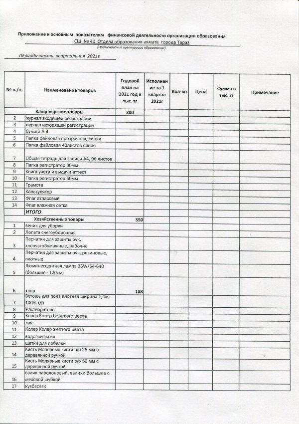 01 апрель 2021 0 1 2 3 4 5 Основные показатели финансовой деятельности КГУ "Гимназия №40 отдела образования акимата города Тараз" по состоянию на 01 апреля 2021г