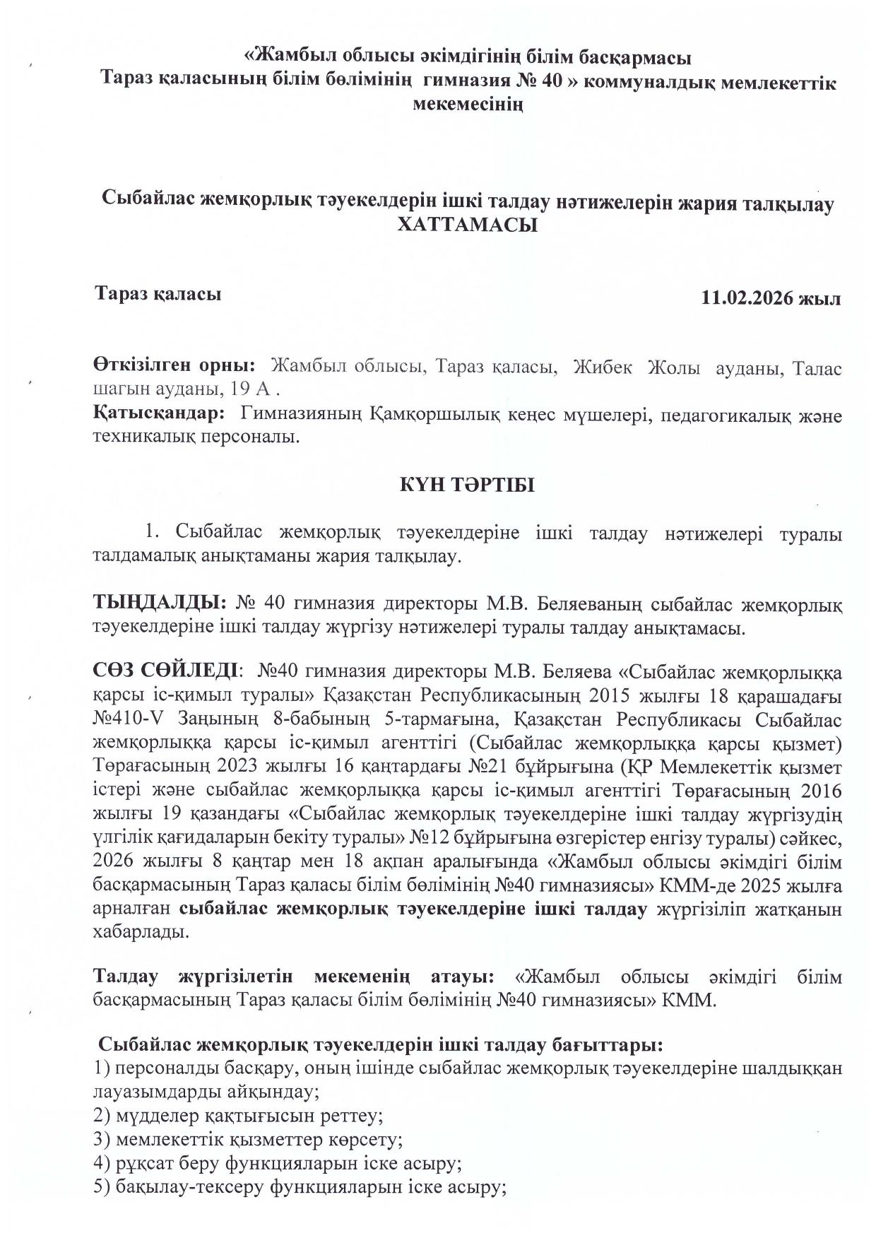 Сыбайлас жемқорлық тәуекелдерін ішкі талдау нәтижелерін жария талқылау ХАТТАМАСЫ » Гимназия №40