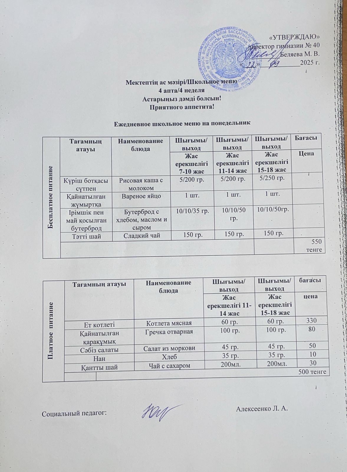 Ежедневное меню на 22.09.2025 г. » Гимназия №40