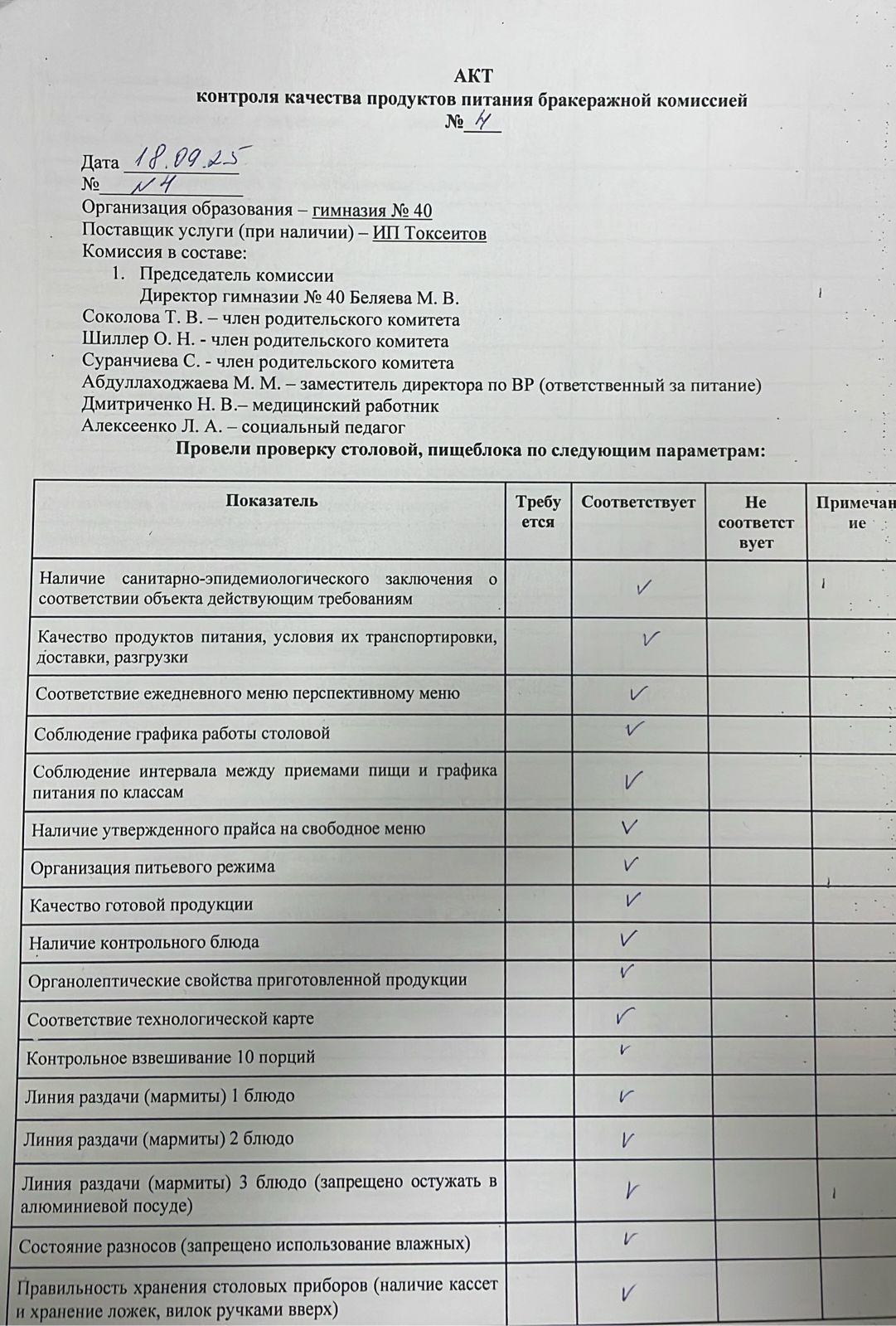 18 сентябрь 2025 0 1 2 3 4 5 Акт контроля качества продуктов питания бракеражной комиссией № 4 за 18.09.2025 г.